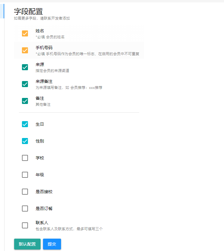 蓝色选框为可选字段,请根据业务需要勾选。如需更多字段,可联系我们添加!