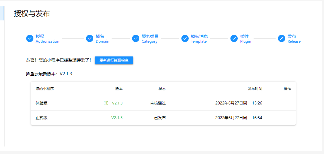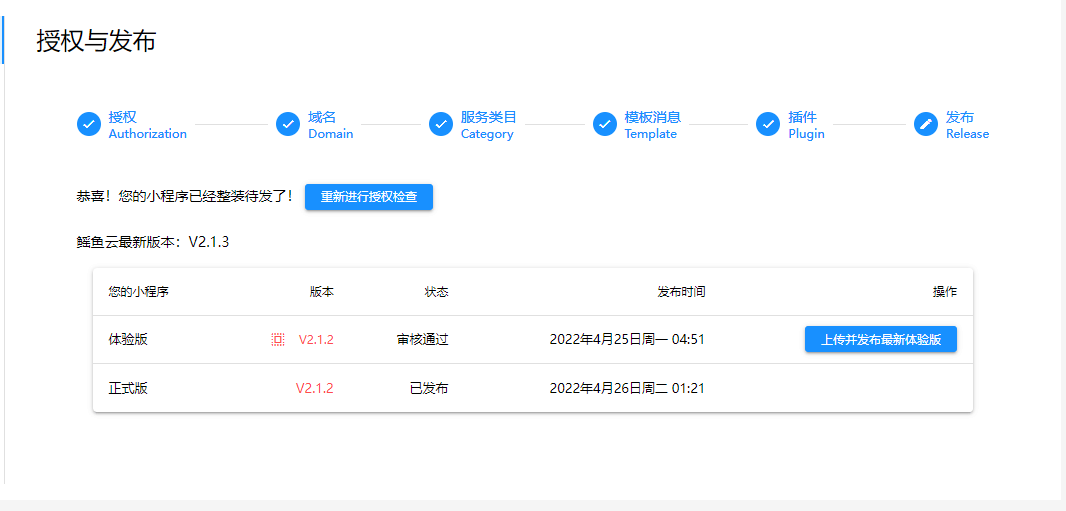 - 在此处查看当前的小程序版本,一般来说授权的步骤将由鳐鱼云为您完成,仅需关注小程序是否是最新版本