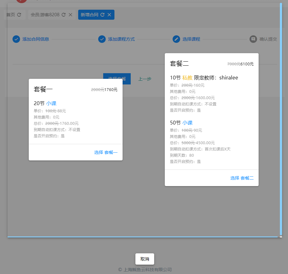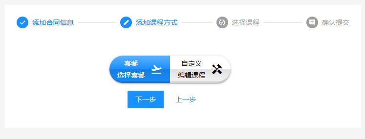 选择套餐后再点击上一步选择自定义 --> 此时已选择的套餐课程仍然保留,可以继续选择添加其他课程。