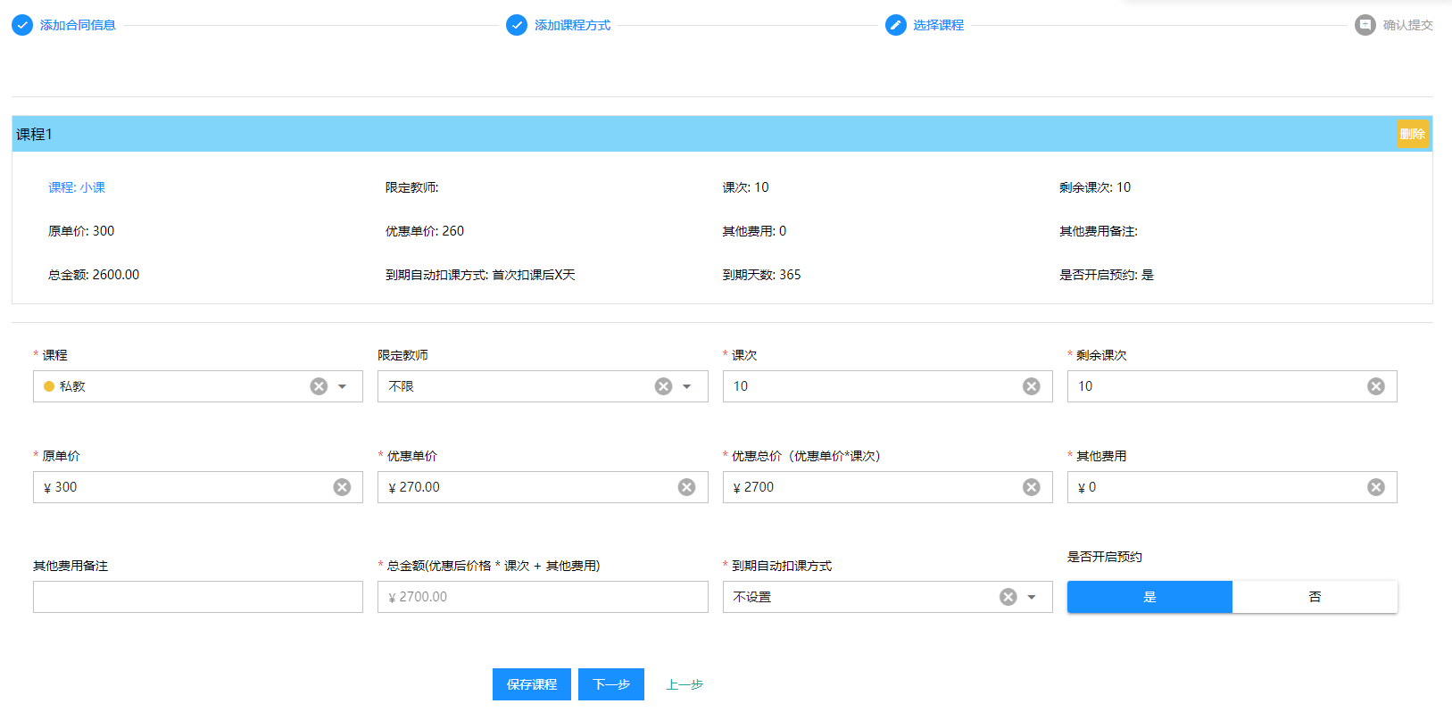 反之可以输入课次和优惠总价,点击空白处、由系统计算出优惠单价