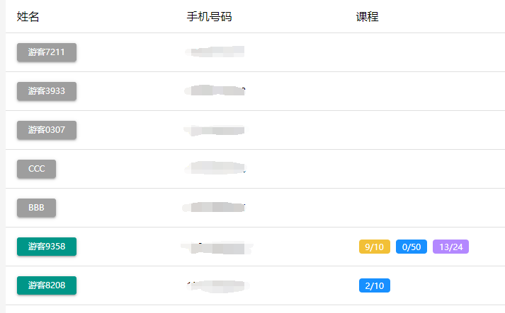 - 未添加合同 / 合同课程已用尽的会员,其姓名显示为灰色